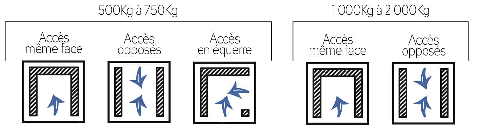 Pour vous proposer le monte-charge accompagné idéal, plusieurs solutions s'offrent à vous en terme de sens des accès.