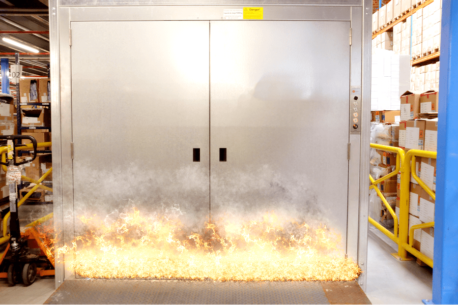La résistance au feu sur un monte-charge accompagné se teste sur les portes palières battantes. La norme en vigueur est la norme Européenne EN 81-58.