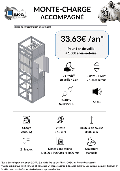 Le monte-charge accompagné BKG est un monte-charge électrique, équipé d'un motoréducteur et d'un tableau de commande avec carte électronique.