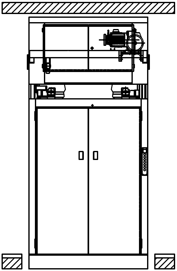 Un monte-charge avec une machinerie haute veut dire que le moteur et tous les principaux composants électriques se trouvent en haut dans la gaine, juste au-dessus de la dernière porte battante. Cette version est la plus courante mais nécessite une hauteur du dernier niveau (HDN) égale ou supérieure à 2 500 mm (du sol fini au plafond). Dans la plupart des cas, la hauteur du dernier niveau (HDN) est égale à la hauteur cabine + 1 300 mm. |