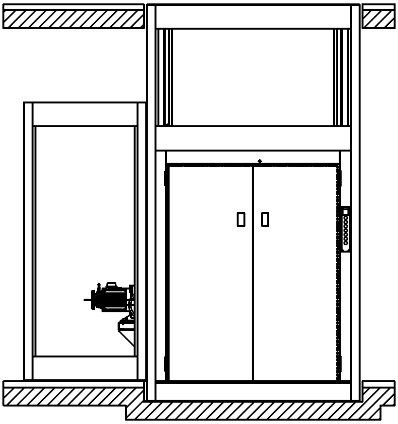 Un monte-charge avec une machinerie déportée veut dire que le moteur et tous les principaux composants électriques se trouvent à côté de la gaine, dans un local machinerie qui sera créé à cet effet (à la charge du client). Cette version avec machinerie latérale est une bonne alternative pour gommer la contrainte d'une hauteur du dernier niveau élevée (HDN). Dans la plupart des cas, la hauteur du dernier niveau (HDN) est égale à la hauteur cabine + 900 mm. |