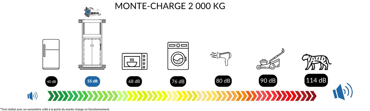 A l'inverse des monte-charges hydrauliques, les monte-charges électriques n'ont pas de centrale hydraulique, ce qui permet de réduire considérablement les nuisances sonores. Cela peut être un facteur déterminant dans le choix d'un monte-charge car suivant l'emplacement de la gaine du monte-charge accompagné, il peut gêner la clientèle ou la quiétude des lieux.